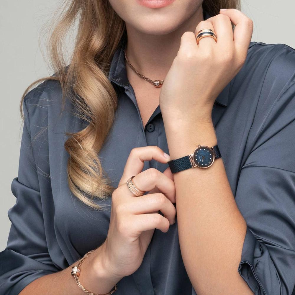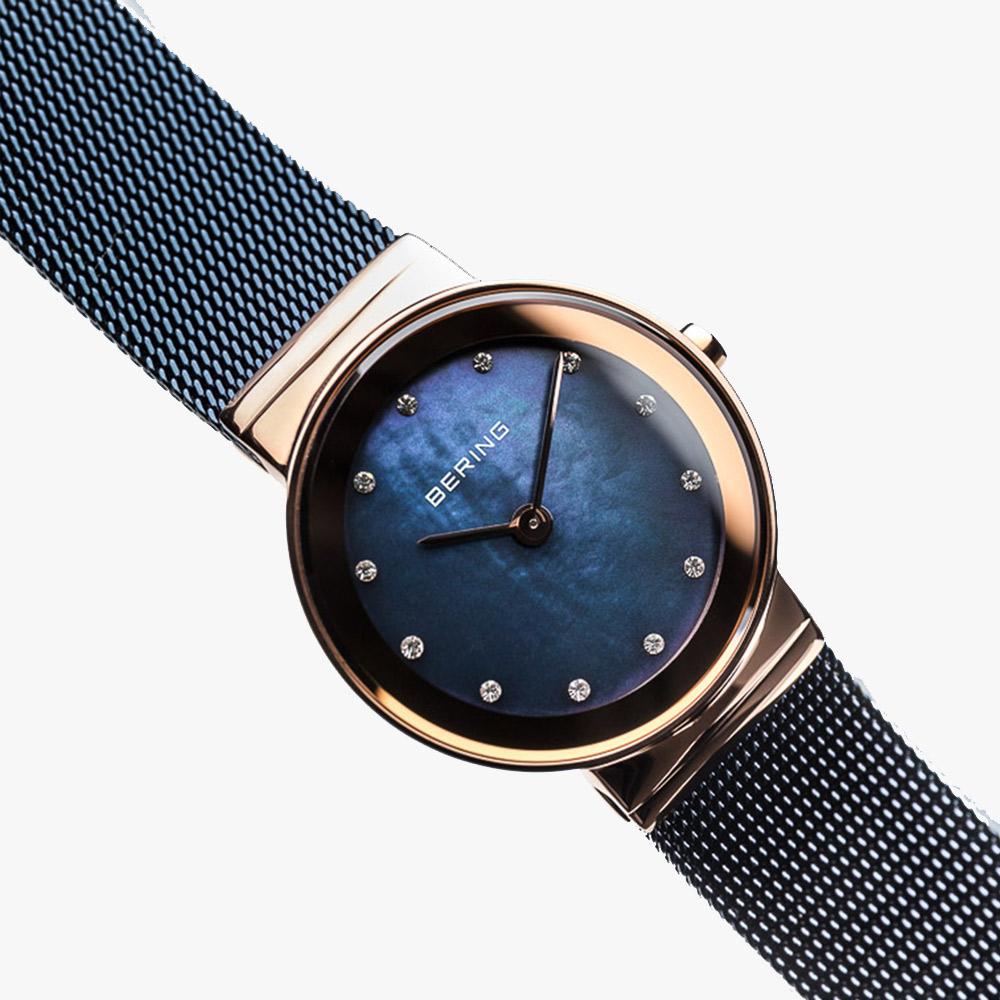 Möchtest du etwas anderes? Dann schauen Sie sich diese schöne Damenuhr von Bering an. Diese Bering Classic 10126-367 Damenuhr ist wirklich ein Gewinner!Das Edelstahl Band in der Farbe Blau dieses Modells passt super bei die Roségold Farbe des Gehäuses aus Edelstahl. Das Gehäuse hat einen Durchmesser von 26 mm und eine Dicke von 6 mm. In das Gehäuse finden wir eine zuverlässige Quarz Uhr, welche unter das Blau Zifferblatt gesteckt ist. Das Gehäuse ist mit Saphir glas und hat eine Wasserbeständigkeit von 5 ATM. Diese wunderschöne Bering Damenuhr hat die folgenden Funktionen;12--Std-Anzeige