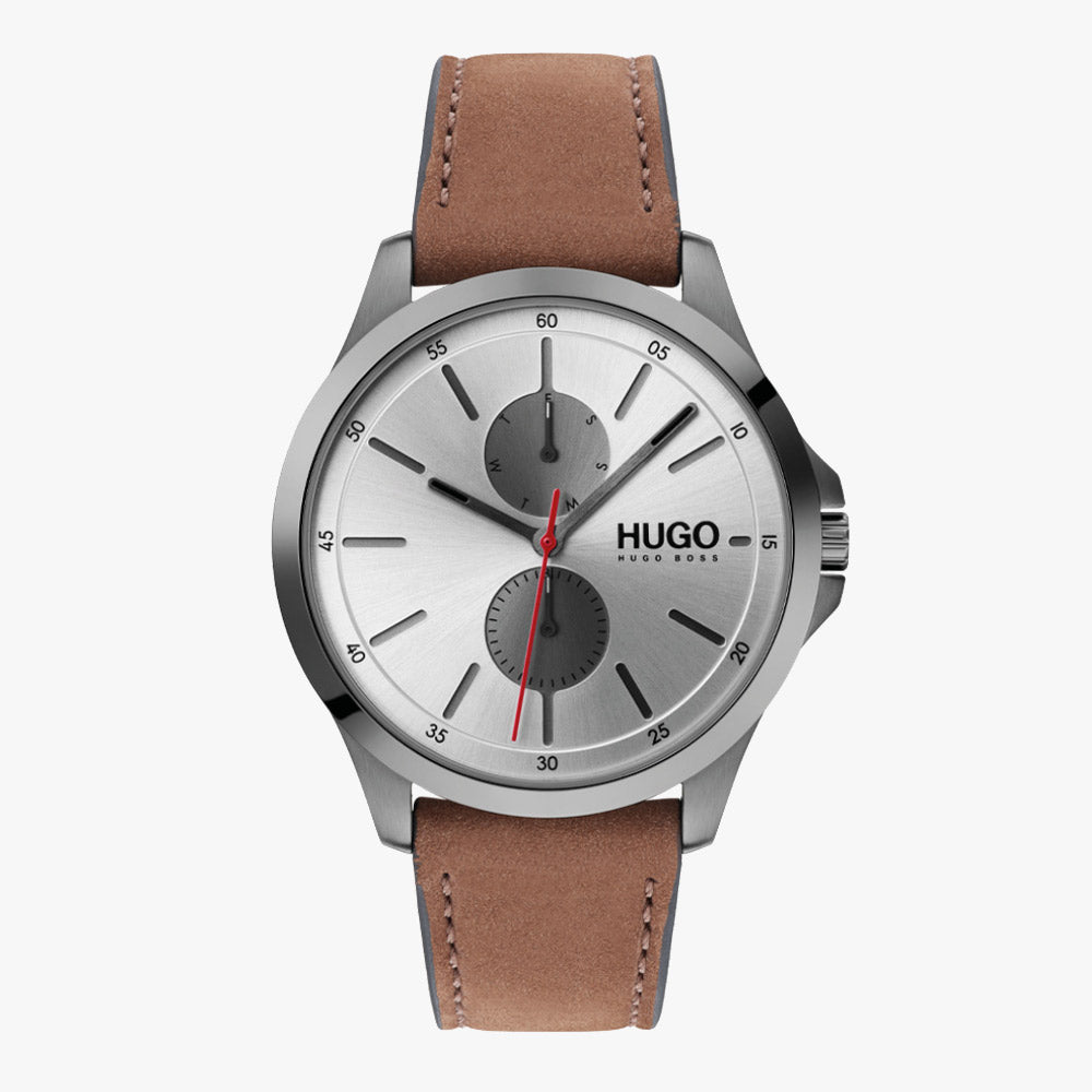 Diese sportliche Hugo HU1530123 #Jump Herrenuhr hat ein luxuriöses Silber mit schwarzem Zifferblatt. Diese luxuriöse Hugo Herrenuhr verfügt über zwei Uhren; Die obere Uhr zeigt die Wochentage an. Die untere Uhr zeigt das Datum. Das schöne silberfarbene Edelstahlgehäuse hat ein bequemes braunes Lederband. Das Armband hat ein wildlederartiges, weiches, mattes Finish und bietet einen luxuriösen Look. Das Armband hat einen Dornschließe mit zwei Schlaufen für den verbleibenden Teil des Armbandes. Hugo Uhren stehen immer für hohe Qualität und sind mit den schönsten Details versehen. Diese einzigartige Hugo-Uhr wird in einer Markenverpackung geliefert.