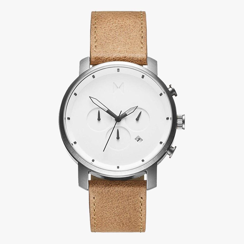 Muss lhre Uhr ersetzt werden? Oder möchten Sie jemandem eine Uhr schenken? Dann könnte diese MVMT Chrono 45 White Caramel D-MC01WT Herrenuhr eine gute Option sein.Die Silber Farbe des Edelstahl Gehäuses fällt auf und passt perfekt zur Weiß Farbe des Zifferblatts. Das Gehäuse hat einen Durchmesser von 45 mm und eine Dicke von 12 mm. Diese MVMT Herrenuhr hat die folgenden Funktionen; 12--Std-Anzeige, Chronograph, Datum.