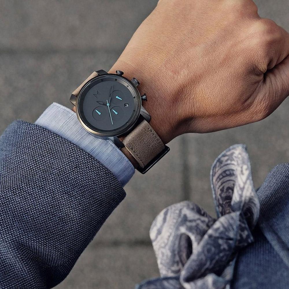 Muss lhre Uhr ersetzt werden? Oder möchten Sie jemandem eine Uhr schenken? Dann könnte diese MVMT Chrono 40 Gunmetal Sandstone D-MC02-GML Herrenuhr eine gute Option sein.Dieses Modell hat ein schönes 40 mm Edelstahl Gehäuse mit einer Dicke von 10 mm. Das Glas dieser MVMT Herrenuhr ist Mineralglas und hat eine Quarzuhr. Das band ist aus Leder gefertigt und hat eine schöne Farbe, nämlich Braun die gut zum Gehäuse in der Farbe Schwarz passt. Außerdem hat das Modell folgende Funktionen; 12--Std-Anzeige, Chronograph, Datum. Diese MVMT D-MC02-GML Uhr hat eine Wasserbeständigkeit von 5 ATM.